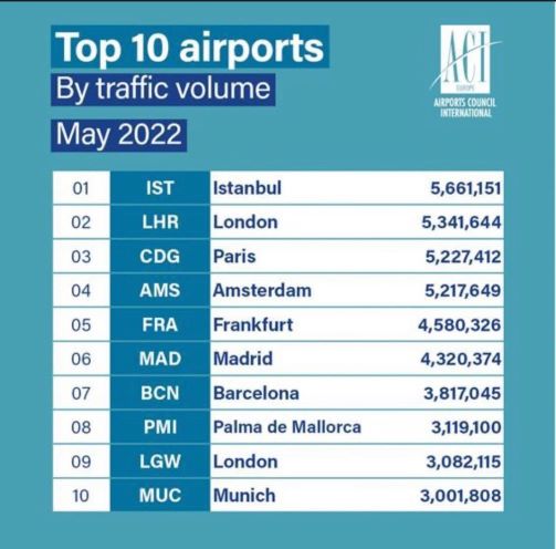 İGA İstanbul Havalimanı ise mayıs ayında ağırladığı 5 milyon 661 bin 151 yolcu ile Avrupa genelinde havalimanları arasında ilk sırada yer aldı. İGA’ yı 5 milyon 341 bin 644 yolcu ile Londra, 5 milyon 227 bin 412 yolcu ile Paris Charles De Gulle takip etti.