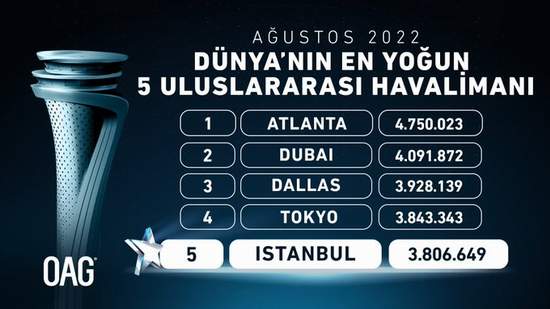 OAG tarafından yayımlanan ve her ay güncellenen Busiest Airport in the World raporuna göre İGA İstanbul Havalimanı, Ağustos 2022 itibarıyla 14’üncü sıradan 5’inci sıraya yükselerek dünyanın en yoğun 10 uluslararası havalimanı arasına girdi.