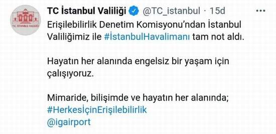 Valiliğin resmi Twitter hesabından yapılan açıklamada; “Erişilebilirlik Denetim Komisyonu’ndan İstanbul Valiliğimiz ile İstanbul Havalimanı tam not aldı.