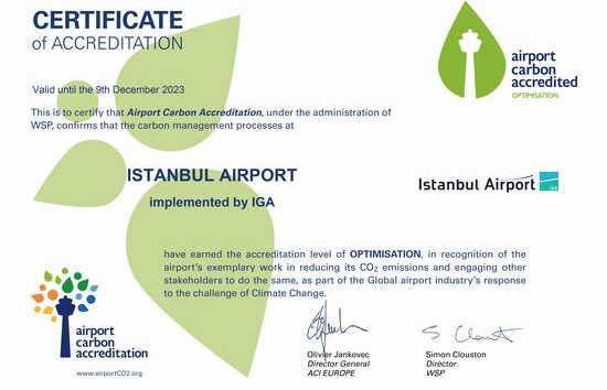 İGA İstanbul Havalimanı, çevre ve sürdürülebilirlik politikası çerçevesinde yürüttüğü karbon ayakizi yönetme ve azaltma çalışmaları neticesinde, Uluslararası Havalimanları Konseyi (ACI Europe) tarafından verilen Havalimanı Karbon Akreditasyonu kapsamındaki Birinci Seviye Karbon Salımı Sertifikasını kısa bir süre içerisinde Seviye 3’e yükselterek uluslararası sertifikayı almaya hak kazandı.