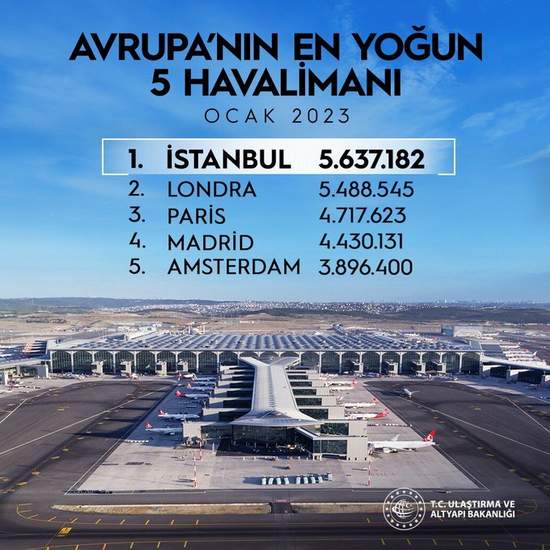 İGA İstanbul Havalimanı Ocak ayında ağırladığı 5 milyon 637 bin 182 milyon yolcu ile Avrupa’nın en yoğun havalimanı oldu.