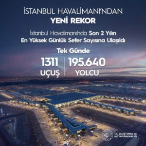 Ulaştırma ve Altyapı Bakanı Adil Karaismailoğlu sosyal medya hesabından yaptığı açıklamada, ”İstanbul Havalimanı’ndan pandemi döneminden sonra yeni rekor! 30 Nisan 2022 tarihinde bir günde 1311 uçuş!” ifadelerini kullanmışı.