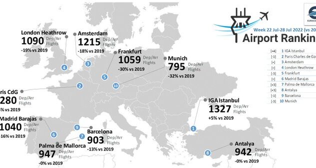EUROCONTROL, 22-28 Temmuz’u kapsayan haftaya ilişkin kapsamlı uçuş verilerini yayınladı. Buna göre İstanbul Havalimanı Avrupa’daki en yoğun meydanlar arasında zirvedeki yerini korudu.
