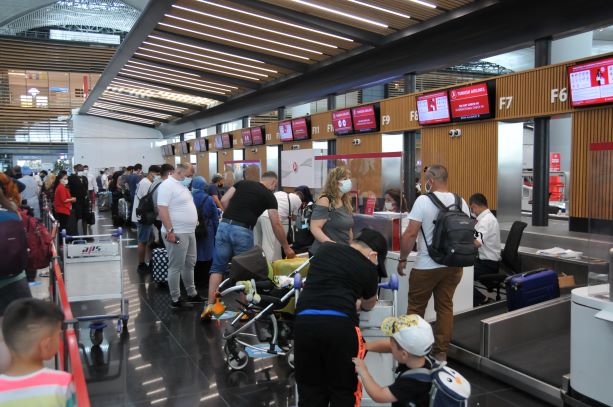 Bayram tatilini yurt dışı ve yurt içinde değerlendirmek isteyen yolcular dün olduğu gibi bugün de İstanbul Havalimanı’nda yoğunluğa neden oldu. Yoğunluk nedeniyle terminal girişlerinde x-ray güvenlik noktalarında ve check-in kontuarlarında kuyruklar oluştu. Havalimanındaki görevli hijyen timleri, sosyal mesafeye dikkat etmeleri ve maske takmaları için yolcuları uyardı.
