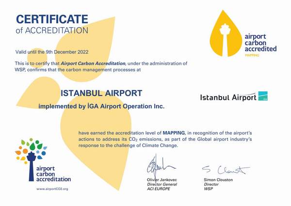 Dünyanın en önemli küresel aktarma merkezi ve 5 yıldızlı havalimanı unvanıyla yolcularına sunduğu akıllı teknolojilerle öne çıkan İstanbul Havalimanı, Havalimanı Karbon Akreditasyonu (Airport Carbon Accreditation) kapsamında Uluslararası Havalimanları Konseyi (ACI) tarafından verilen “Birinci Seviye Karbon Salımı Sertifikası’nı” almaya hak kazandı.