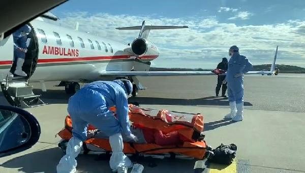 Sağlık görevlileri tarafından bulunduğu basınçlı sedyeyle uçaktan alınan 47 yaşındaki Gülüşken, ambulansa taşındı.