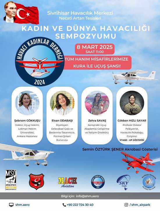 Havacı Kadınlar Derneği tarafından düzenlenen Kadın ve Dünya Havacılığı Sempozyumu”, Sivrihisar Havacılık Merkezi, Necati Artan Tesisleri’nde (Eskişehir), 08 Mart 2025 tarihinde dördüncü kez düzenlenecek.