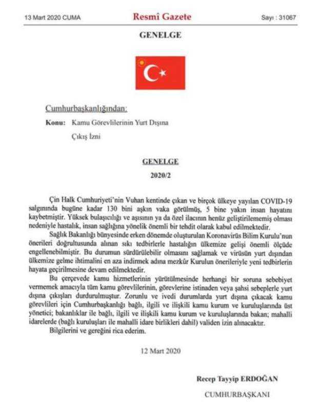 Kamu personelinin yurt dışına çıkışı durduruldu. Kamu görevlilerinin yurt dışına çıkışlarının durdurulmasına ilişkin Cumhurbaşkanlığı genelgesi, Resmi Gazete’de yayımlandı.