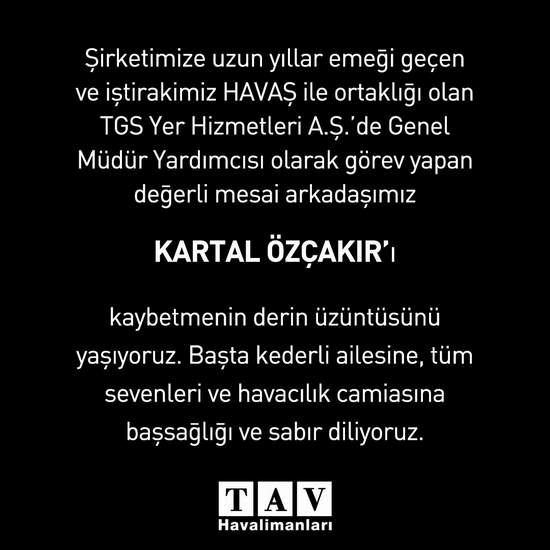 Son yolculuğuna uğurlanacak Kartal Özçakır için, TGS ve TAV Havalimanları’ndan taziye mesajları yayınlandı.