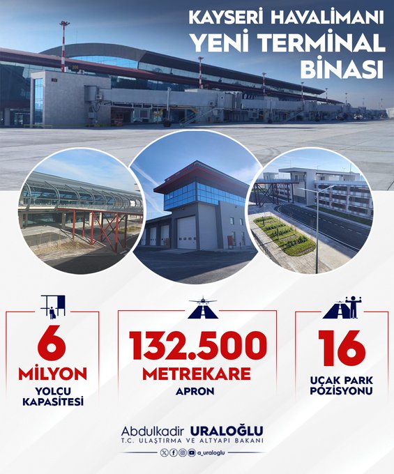 Ulaştırma ve Altyapı Bakanı Abdülkadir Uraloğlu, Kayseri Havalimanı Yeni Terminal Binası ve apron yapımı çalışmalarında son aşamaya gelindiğini bildiri.