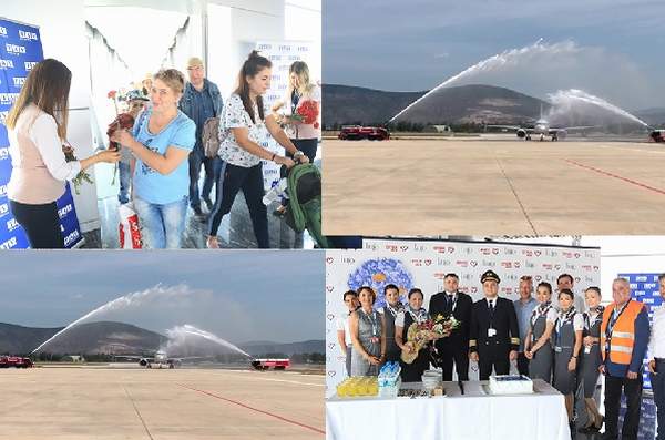 Almatı şehrinden ilk turist kafilesini taşıyan yolcu uçağı, Milas-Bodrum Havalimanı pistinde itfaiye araçlarının oluşturduğu “su takı” töreniyle karşılandı.