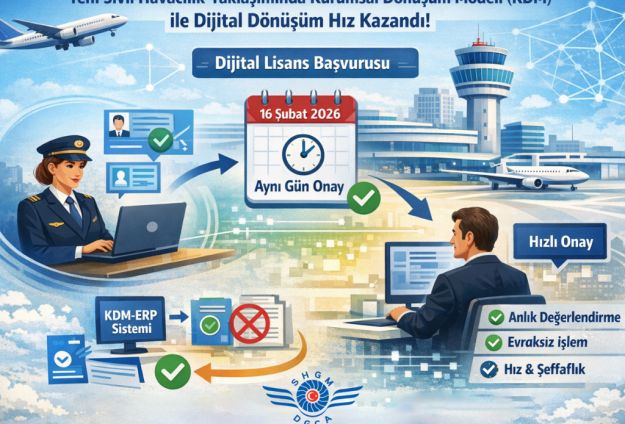 Sivil havacılık sektöründe dijitalleşme çalışmaları kapsamında hayata geçirilen KDM-ERP sistemi üzerinden yürütülen dijital lisans uygulamaları ile başvuru süreçlerinde önemli bir dönüşüm sağlandı. Yeni sistem ile hız, şeffaflık ve etkinlik ön plana çıkarıldı.