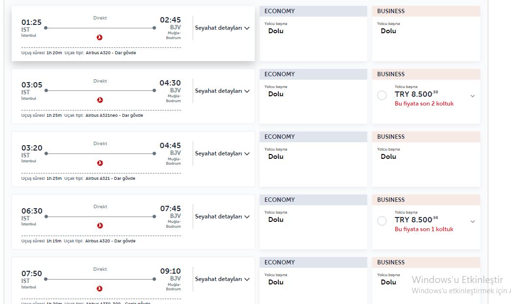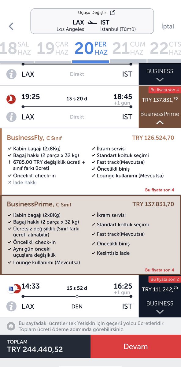 Kurban Bayramı nedeniyle artan talebi fırsata çeviren Türk Hava Yolları yaptığı İstanbul – Los Angeles uçuşlarında bilet fiyatları dikkat çekici rakamlara ulaştı. Bilet fiyatları 16 – 20 Haziran’da gidiş dönüş 245 bin TL’ye kadar çıktı. Bu bilet fiyatı, THY’nin bir direkt seferdeki en pahalı gidiş dönüş bileti oldu. Türk Hava Yolları’nın iç hat business bileti ise 8 bin 500 liradan satışa çıkarıldı.