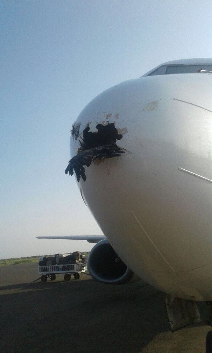 Hartum’dan kalkan B737-800 tipi uçağa, El Fasher Havalimanı’na son yaklaşmada kuş çarptı uçağın radomunda delik oluştu.
