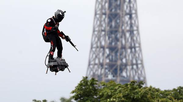 Fransız ordusunda yedek asker olan Franky Zapata, Fransa Cumhurbaşkanı Emmanuel Macron, Almanya Başbakanı Angela Merkel ve diğer Avrupalı liderlerin katıldığı törende elinde bir tüfekle uçmuştu.