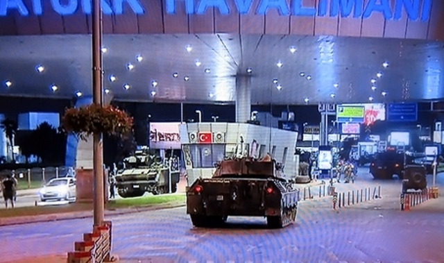 Atatürk Havalimanı trafiğe kapatılırken, havalimanı önünde tanklar bekliyor.