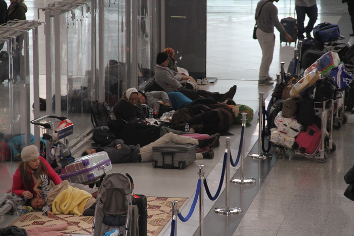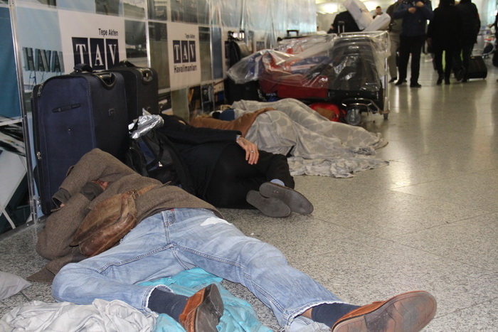 Otel bağlantısı olmayanlar ise dış hatlar ve iç hatlarda terminalin beton zemininde yattı. Kimi personelden bulduğu battaniyeyi, kimi ceketini kimi de paltosun yere sererek, uyumaya çalıştı. Kendini havalimanı mescitlerine atanlar oldu. Mescitte yer bulamayanlar namaz kılınan hasırlara sarılarak dışarıda uyudu. Ailece mağdur olanlarsa kendi imkanlarınca küçük çadırlar kurarak, bekleyişlerini sürdürdü. Havalimanına insan seli akarken, dün uçamayanların bugün gönderilmeye çalışılacağı belirtiliyor.