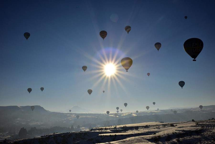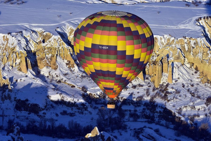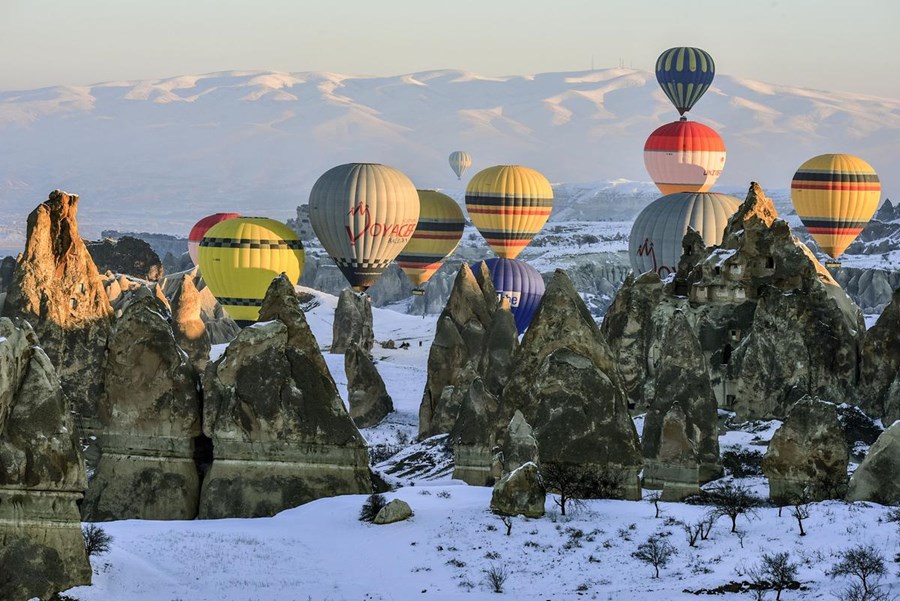 TÜRKİYE’NİN ÖNEMLİ TURİZM MERKEZLERİNDEN, DOĞA HARİKASI PERİBACALARIYLA ÜNLÜ KAPADOKYA BÖLGESİNE GELEN YERLİ VE YABANCI TURİSTLER, KIŞ MEVSİMİNDE KATILDIKLARI BALON TURLARIYLA KAPADOKYA’NIN KARLA KAPLI EŞSİZ MANZARASINI GÖKYÜZÜNDEN SEYRETMENİN KEYFİNİ YAŞIYOR.