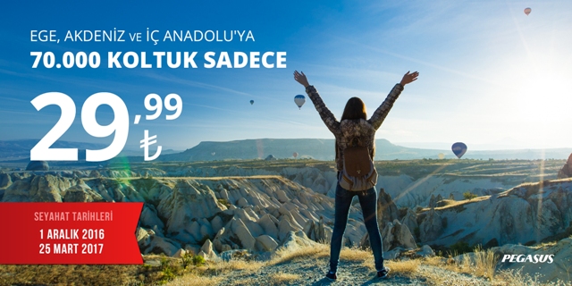 Pegasus Hava Yolları 14 – 17 Kasım tarihleri arasında seçili Ege, Akdeniz ve İç Anadolu Bölgesi uçuş noktalarına biletini flypgs.com’dan alan misafirlerine, 1 Aralık 2016 – 25 Mart 2017 tarihleri arasında 29.99 TL’ye seyahat etme fırsatı sunuyor ve misafirlerini yurt içinde dilediği gibi uçmanın tadını çıkarmaya davet ediyor.