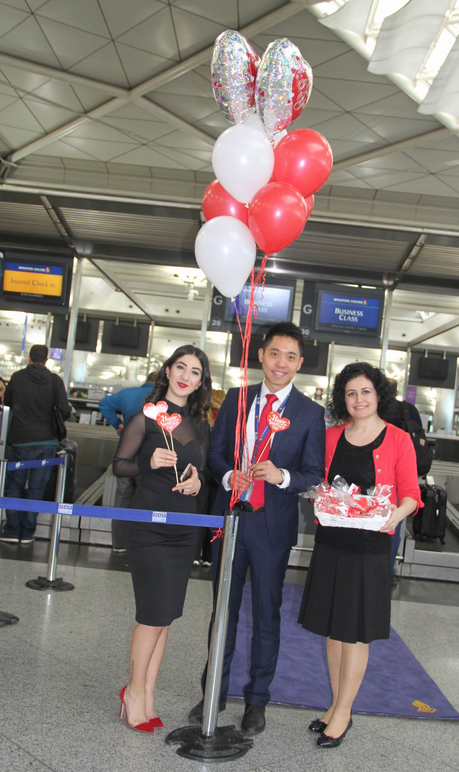 Bu arada Singapur’a bayi toplantısı için giden bir gurup Türk yolcu ise sevgililer günü çerçevesinde birlikte poz verdi. İstanbul-Singapur seferini gerçekleştirecek olan uçağın yolcuları için, Atatürk Havalimanı Dış Hatlar Terminali Gidiş Katı’nda bulunan Singapur Hava Yolları kontuarında “Sevgililer Günü” kutlandı. Uzakdoğulu yolcular eşleri ve sevgilileriyle selfie çekti. Singapur’a bayi toplantısı için giden bir gurup Türk yolcu ise erkek erkeğe sevgililer günü çerçevesinde poz verince havalimanında neşeli dakikalar yaşandı. Türk yolcular, kameralara seslenerek eşlerinin sevgililer gününü kutlamayı da ihmal etmediler. Yolculara kalp şeklinde hazırlanmış küçük kurabiyeler dağıtan Singapur Hava Yolları Atatürk Havalimanı İstasyon Müdürü Chuan Kai Lim ” Yolcularımız 14 Şubat’ta havada oldukları için bugünden Sevgililer Günü’nü kutlamak istedik. Küçük kurabiyelerimiz ve dekoratif hediyelerimiz var. Fotoğraflarını ve hissettiklerini sosyal medyada paylaşan üç yolcumuza da küçük hediyelerimiz olacak. Herkesin Sevgililer Günü’nü kutlarız ” dedi.