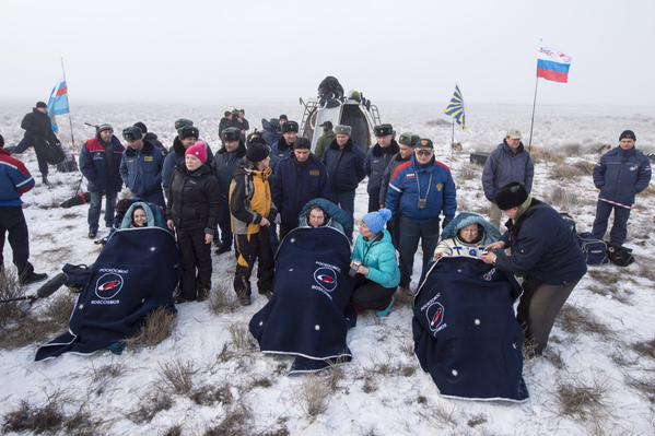İyi görünen astronotlar, yer çekimine adapte olmaları ve ilk sağlık kontrolleri için hemen yaslanan koltuk biçimdeki araçlara alındı. Associated Press’in haberinde yer alan bilgilere göre; hava sıcaklığının sıfırın altında seyretmesi nedeniyle üç astronot da kalın giysilerle sarılıp sarmalandı.