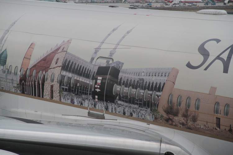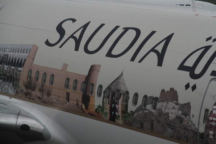 Suudi Arabistan Havayolları bir uçağının gövdesine şehirlerinin önemli yerlerinin resimlerini giydirdi.