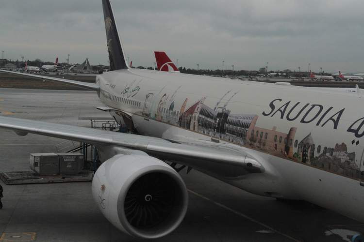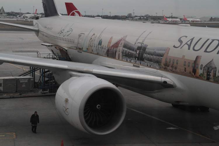 Suudi Aabistan Havayolları’nın Atatürk Havalimanı’na inen özel tasarımla giydirilen uçağı yolcular ve personel tarafından ilgi gördü.
