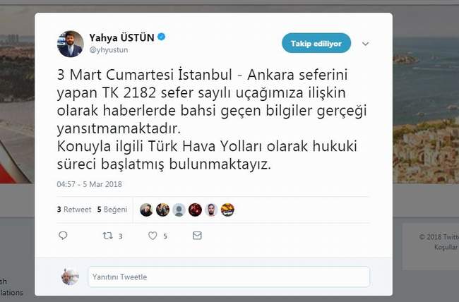 Yapılan Haberle ilgili hukuki sürecin başlatıldığını paylaşan Türk Hava Yolları Basın Müşavirliği Başkanı Yahya Üstün, “ 3 Mart Cumartesi TK 2182 sefer sayılı uçağımıza ilişkin olarak haberlerde bahsi geçen bilgiler gerçeği yansıtmamaktadır. Konuyla ilgili Türk Hava Yolları olarak hukuki süreçi başlatmış bulunmaktayız” paylaşımı yaptı.