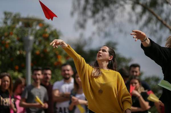 İzmir Ekonomi Üniversitesi’nde Türk Hava Kurumunca (THK) düzenlenen etkinlikte, yarışmaya üçer kişiden oluşan gruplar halinde katılan öğrenciler THK eğitimcilerinin gözetmenliğinde kağıttan model uçak yaptı.