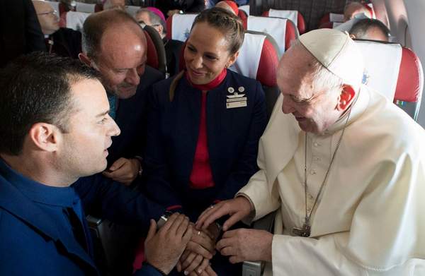 Sohbetleri sırasında çiftin kilise nikâhı kıymadıklarını öğrenen Papa, hemen orada, 36 bin fit yükseklikte dinî bir tören düzenlemeyi önerdi. Papa, “Emin misiniz?” diye kendisine soran çifte “Ya siz, emin misiniz?” diye sordu gülümseyerek.