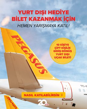 Pegasus Hava Yolları, 20. yılına özel 10 kişiye çift kişilik gidiş-dönüş yurt dışı bileti hediye edecek.