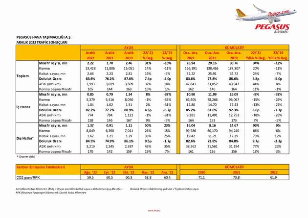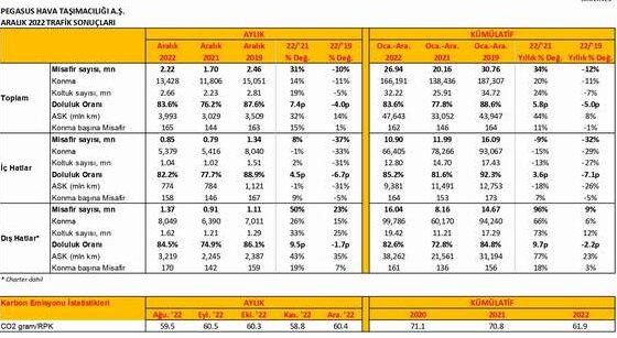Yapılan açıklamaya göre havayolu 2022 Aralık ayında 850 bini iç hatlarda,  milyon 370 bini dış hatlarda olmak üzere toplam 2 milyon 220 bin yolcu taşıdı. Bu dönemde Pegasus’un yolcu dolulk oranı ise yüzde yüzde 836 olarak gerçekleşti.