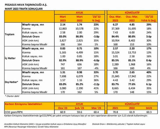Pegasus Hava Yolları Kamuyu Aydınlatma Platformu (KAP) mart ayı trafik sonuçlarını ve karbon emisyon istatistiklerini açıkladı.
