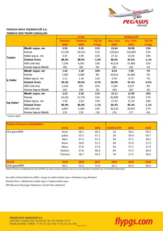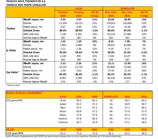 Pegasus Hava Yolları, Temmuz ayı rakamlarını Kamuyu Aydınlatma Platformu’na (KAP) açıkladı