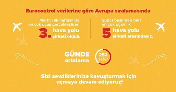 Pegasusu Havayolları sosyal medya hesabından yaptığı açıklamada, Eurocontrol verilerine göre 1 Ocak-9 Mart 2021 tarihleri arasında uçuş trafiği olarak Avrupa sıralamasında en üstlerde olmaktan mutluluk duyuyoruz! Sizler için uçmaya, sizi sevdiklerinize kavuşturmaya devam ediyoruz!”ifadelerini kullandı.