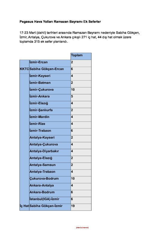 Pegasus Hava Yolları, Ramazan Bayramı’nda yolcu talebini karşılamak üzere  17-23 Mart (dahil) tarihleri arasında  Sabiha Gökçen, İzmir, Antalya, Çukurova ve Ankara çıkışlı 271 iç hat, 44 dış hat olmak üzere toplamda 315 ek sefer planlandı.