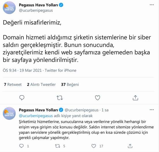 Pegasus Hava Yolları, “Domain hizmeti aldığımız şirketin sistemlerine bir siber saldırı gerçekleşmiştir. Bunun sonucunda, ziyaretçilerimiz kendi web sayfamıza gelemeden başka bir sayfaya yönlendirilmiştir” açıklaması yaptı. Açıklamada şirketin hizmetlerine, sunucularına veya verilerine yönelik herhangi bir erişim veya girişimin söz konusu olmadığının altı çizildi.