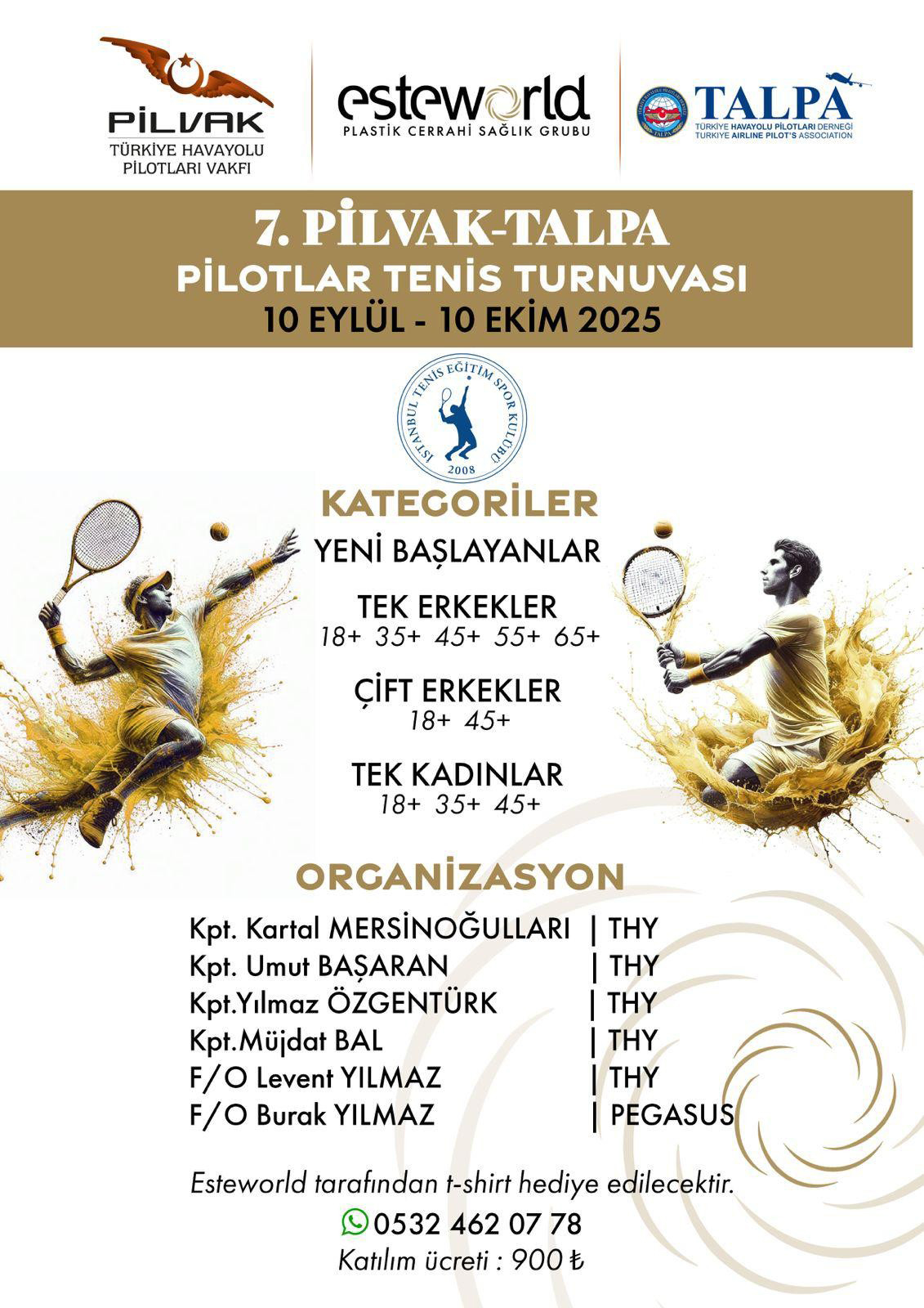 Türkiye Havayolu Pilotları Derneği (TALPA) ve Pilotlar Vakfı (PİLVAK) iş birliğiyle düzenlenen 7. Pilotlar Tenis Turnuvası, 10 Eylül – 10 Ekim 2025 tarihleri arasında yapılıyor.