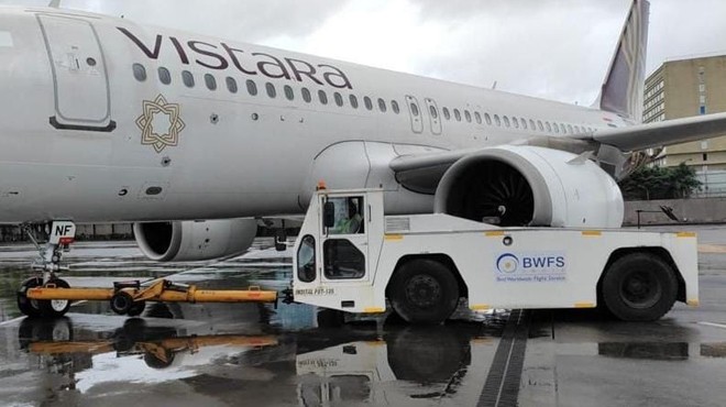 Mumbai Havalimanında, bağlantı pimi kopan çekici, push back sırasında Vistara uçağının sol motoruna çarptı