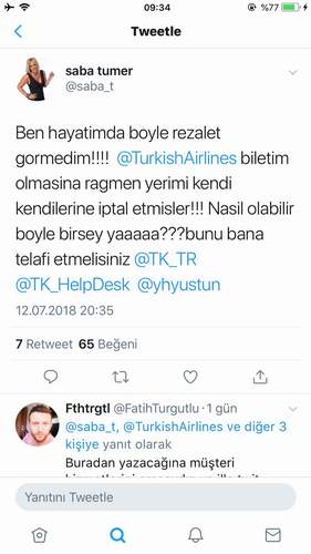 Ünlü sunucu Saba Tümer, Türk Hava Yolların’ndan aldığı biletin kendisinin haberi olmadan iptal edildiğini resmi Twitter hesabından yazarak, bu durumun düzeltilmesini istedi.  Biletinin Türk Hava Yolların tarafından kendisinin haberi olmadan biletinin  iptal edildiğini söyleyen Tümer,” Ben hayatımda böyle rezalet görmedim!! Turkish Airlines biletim olmasına rağmen yerimi kendi kendilerine iptal etmişler!! Nasıl olabilir böyle bişey yaaaaa? Bunu bana telafi etmelisiniz” paylaşımını yaptı