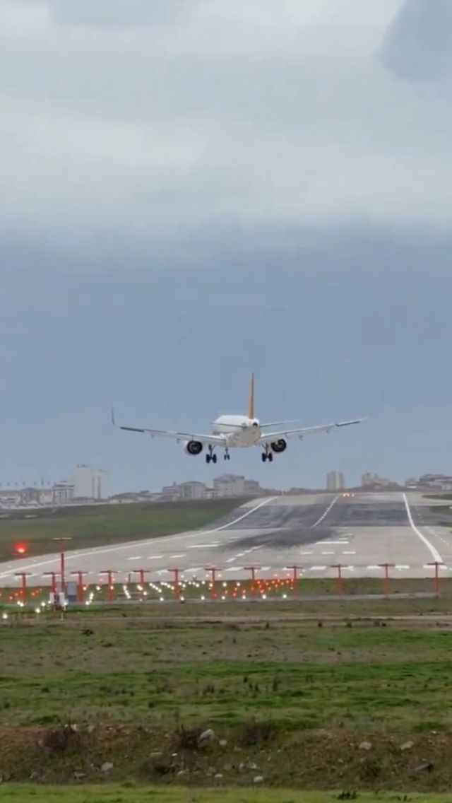 Sabiha Gökçen Havalimanı’na iniş yapmak üzere alçalan bir uçak, olumsuz hava koşulları nedeniyle pisti pas geçti. Pistin üzerinde bir süre askıda kalan uçakta zor anlar yaşandı.