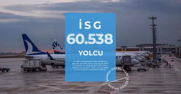 Sabiha Gökçen Havalimanı sosyal medya hesabından yaptığı açıklamada, ”12 Mart tarihinde elde ettiğimiz günlük 60.538 yolcu sayısıyla 2021 yılındaki en yüksek günlük yolcu rakamına ulaştık. Bizi tercih eden yolcularımıza teşekkür ederiz.”  ifadelerini kullandı.