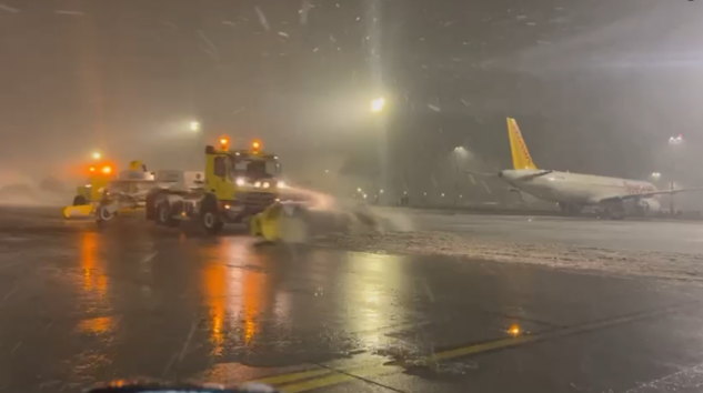 Sabiha Gökçen Havalimanı’nda HEAŞ’ın yürüttüğü karla mücadele çalışmalarıyla pistler açık tutuluyor.