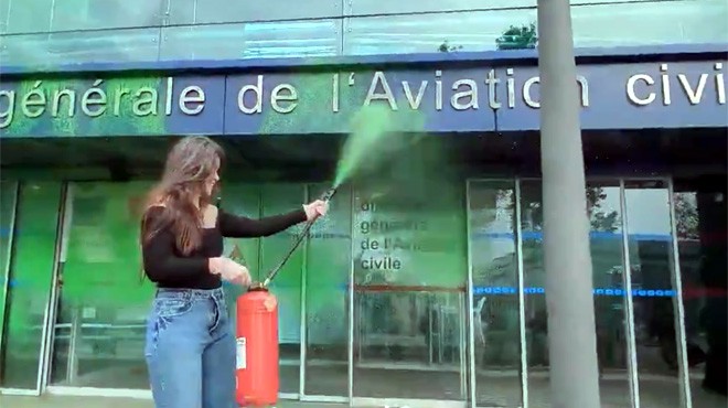 Fransa’da aktivistler, Sivil Havacılık Genel Müdürlüğü Binası önünde protesto eylemi gerçekleştirdi. Protestocular bina girişini yeşile boyadı