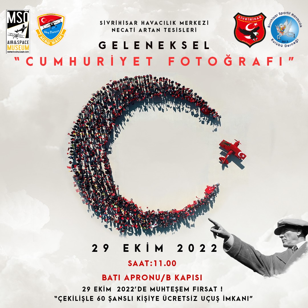 Sivrihisar Havacılık Merkezi’nde, 29 Ekim 2022 Cumartesi günü düzenlenecek ve bu sene dokuzuncu kez yapılacak olan “Geleneksel Cumhuriyet Fotoğrafı” organizasyonu ile 29 Ekim Cumhuriyet Bayramı büyük bir coşkuyla kutlanacak.