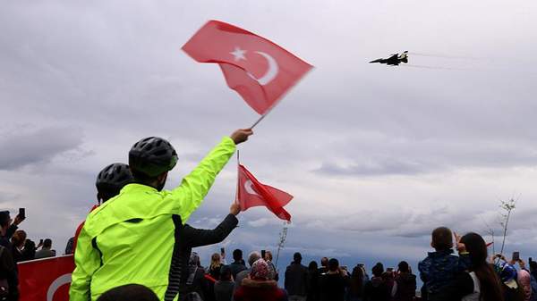 Mehmetçik’in F-16 uçağıyla yaptığı nefes kesen gösteriyi izleyenler, özellikle alçak uçuşlar sırasında gösteri ekibine alkışlar ve ıslıklarla destek verdi.