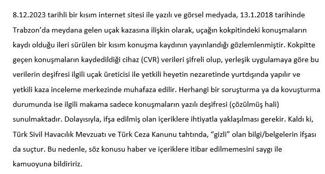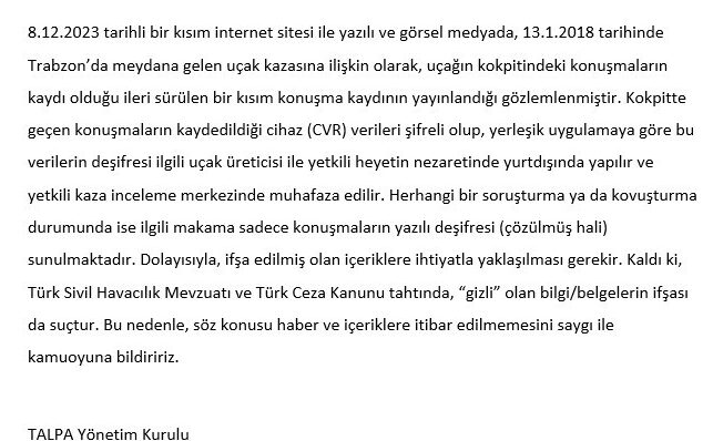 Türkiye Havayolları Pilotları Derneği (TALPA), 2018 yılında Trabzon’da meydana gelen uçak kazasına ilişkin uçak kokpitin geçtiği iddia edilen ses kayıtlarına ihtiyatla yaklaşılması gerektiğini bildirdi.