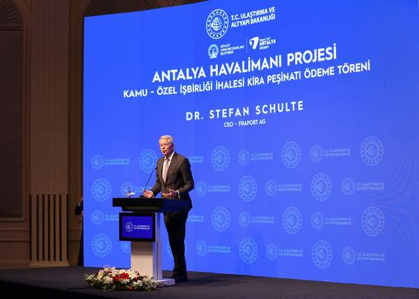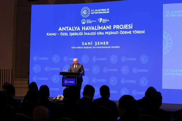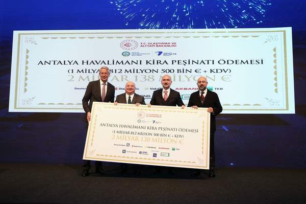 TAV Havalimanları ve Fraport’un oluşturduğu ortak girişim, Antalya Havalimanı’nın 2052’ye kadar işletme hakkı için belirlenen 7 milyar 250 milyon avroluk kira bedelinin yüzde 25’ini ödedi. Bugün düzenlenen törene Ulaştırma ve Altyapı Bakanı Adil Karaismailoğlu, DHMİ Genel Müdürü Hüseyin Keskin, TAV Havalimanları İcra Kurulu Başkanı Sani Şener, Fraport AG CEO’su Dr. Stefan Schulte ve davetliler katıldı.
