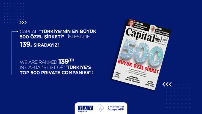 TAV Havalimanları sosyal medya hesabından yaptığı paylaşımda ”Capital Dergisi tarafından “Türkiye’nin En Büyük 500 Özel Şirketi” listesinde bu sene de iştiraklerimizle birlikte yer almaktan ve Türkiye’de en fazla istihdam yaratan 25 marka arasında bulunmaktan dolayı mutluluk duyuyoruz.” ifadelerine yer verdi.