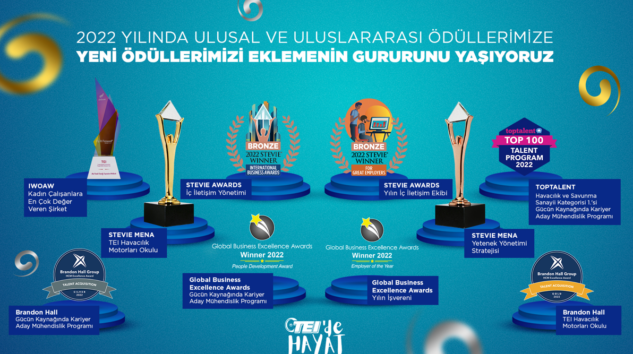 TEI, dünya genelinde en iyi şirketlerin ödüllendirildiği uluslararası bir program olan “Stevie Awards” organizasyonu kapsamında, “Middle East & North Africa Stevie Awards” programında, 2022’de 8.000’den fazla katılımcının yer aldığı çevrimiçi eğitim programı olan Havacılık Motorları Okulu ile “İnsan Kaynakları Yönetimi Planlama ve Uygulama (Human Resources Management Planning & Practice)” kategorisinde “Altın Ödüle” layık görüldü. Yine İnsan Kaynakları Yönetimi Planlama ve Uygulama kategorisinde Yetenek Yönetimi Stratejisi çalışmalarıyla ayrıca bir “Bronz Ödül” daha aldı.